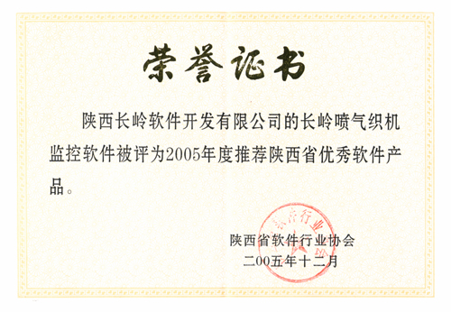2006年1月12日,在陜西省軟件產(chǎn)業(yè)工作會議暨省軟協(xié)一屆五次會員大會上,公布表彰“2005年度優(yōu)秀軟件企業(yè)”、“2005年度推薦優(yōu)秀軟件產(chǎn)品”、“2005年度陜西省優(yōu)秀軟件人才”,我公司被授予陜西省優(yōu)秀軟件企業(yè)榮譽稱號,紡研所設(shè)計員李永紅被評為陜西省優(yōu)秀軟件人才、長嶺噴氣織機監(jiān)控軟件被評為陜西省優(yōu)秀軟件產(chǎn)品。