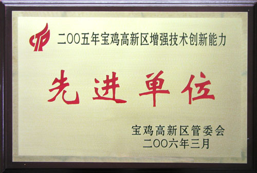 為弘揚先進,鼓勵和支持企業(yè)增強技術(shù)創(chuàng)新,在高新區(qū)營造濃郁的創(chuàng)新創(chuàng)業(yè)氛圍,高新區(qū)管委會對2005年度區(qū)內(nèi)技術(shù)創(chuàng)新工作成效突出的科技型企業(yè)進行表彰,授予我公司等12家企業(yè)“2005年寶雞高新區(qū)增強技術(shù)創(chuàng)新能力”先進單位稱號,獎勵企業(yè)2萬元。希望受表彰的企業(yè)再接再厲,進一步發(fā)揮在高新區(qū)創(chuàng)新能力建設(shè)中的示范帶頭作用,為企業(yè)發(fā)展和高新區(qū)經(jīng)濟持續(xù)快速發(fā)展做出貢獻。