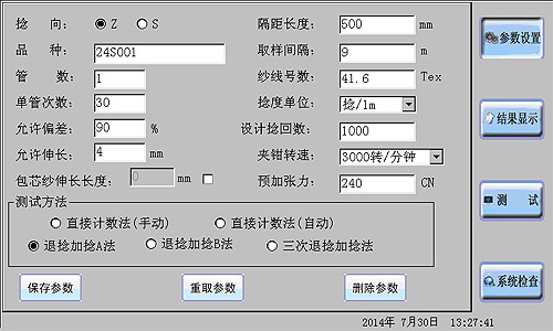 2.將管紗通過(guò)紗架引紗到主機(jī)換紗架上之后,即可開始測(cè)試。在開始測(cè)試之前,應(yīng)在觸摸屏參數(shù)設(shè)置界面上設(shè)置相關(guān)參數(shù)。